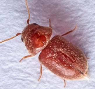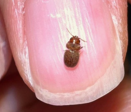 성충은 길이 2-3mm의 타원형으로 적갈색 또는 황갈색을 띱니다. 더듬이는 톱니 모양이며, 몸 전체가 미세한 털로 덮여 있어 약간 둔한 광택을 보입니다. 날개는 몸통을 완전히 덮으며, 비행 능력이 있어 다른 장소로 확산될 수 있습니다.